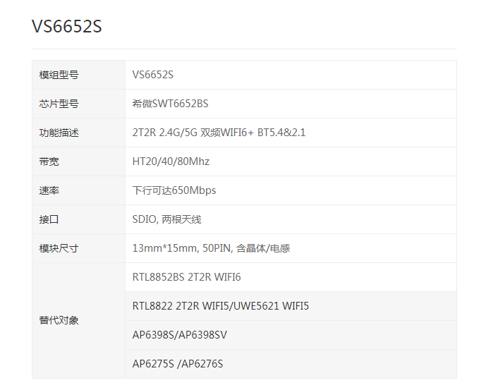 VS6652S 2T2R 2.4G+5G 雙頻WiFi6 +BT5.4&2.1 SDIO接口 支持2天線